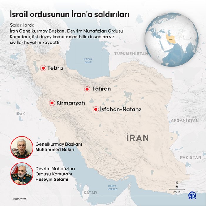 İsrail'in İran’a yönelik saldırılarında İran Genelkurmay Başkanı Muhammed Bakıri, Devrim Muhafızları Genel Komutanı Hüseyin Selami dahil üst düzey askeri yetkililer, 6 nükleer bilim insanı ve siviller hayatını kaybetti.