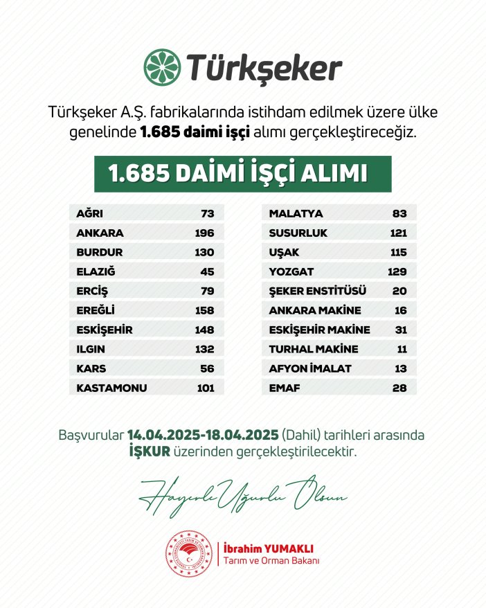 Tarım ve Orman Bakanı İbrahim Yumaklı, sosyal medya hesabından yaptığı açıklamada, "Anadolu'nun bereketli topraklarına bereket, gücüne güç katan Türkşeker, 100'üncü yaşında ülke genelinde 1685 daimi işçiye istihdam kapılarını aralıyor. Milletimize, sektörümüze hayırlı, uğurlu olsun" ifadelerini kullandı.