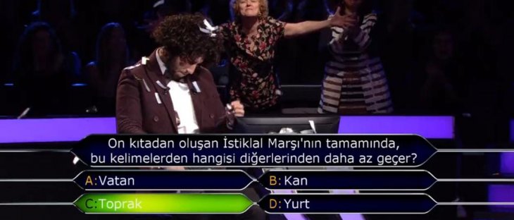 İstiklal Marşı'nın on kıtasını bildiği anlaşılan yarışmacı Arda Ayten, İstiklal Marşı'nı canlı yayında okuyarak sorulan kelimeleri saydı.