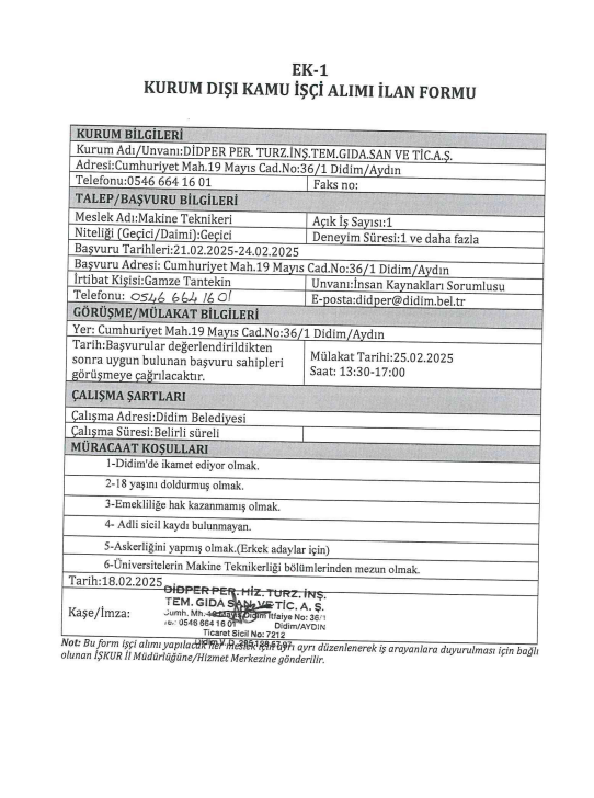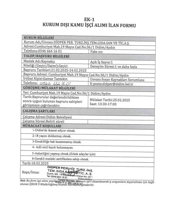 Aydın Didim Didper Per. Hiz. Turz. İnş. Tem. Gıda. San. ve Tic. A.Ş. personel alımı yapacak.