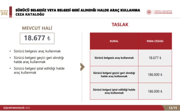 Ancak sürücü belgesi geçici olarak geri alınan ya da iptal edilen kişinin araç kullanması halinde cezası 186 bin lira ceza kesilecek.
