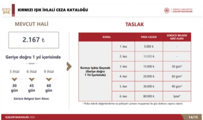 Bu durumda para cezası her defasında artacak ve 6. ihlalde ise 80 bin lira ceza ile birlikte ehliyet iptal edilecek. Yeniden ehliyete başvurduğunda psikiyatri uzmanı ve göz doktorundan rapor istenecek.