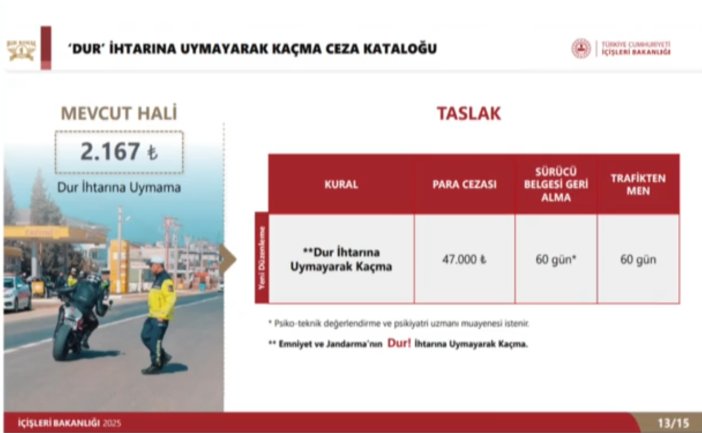 Mevcut halde 2 bin 167 lira olan dur ihtarına uymama cezası, yeni düzenlemeyle dur ihtarına uymayarak kaçma olarak 47 bin liraya çıkarılacak.