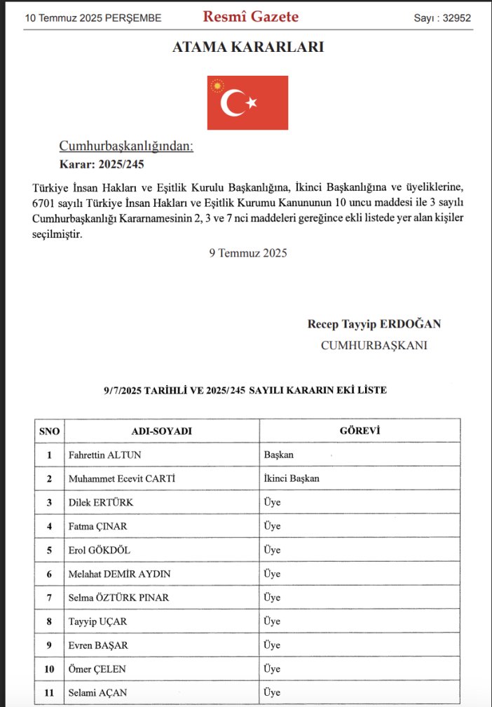 Fahrettin Altun ise Türkiye İnsan Hakları ve Eşitlik Kurulu Başkanı oldu.