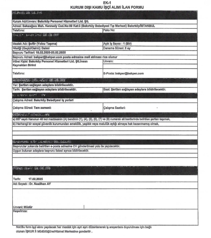 İstanbul Bakırköy Personel Hizmetleri Ltd. Şti. 1 şoför (yolcu taşıma) personeli alacak.