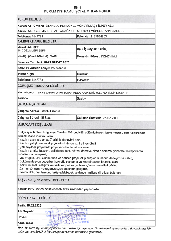 İstanbul Personel Yönetim A.Ş. (İSPER A.Ş.) 1 şef (iş çözümleri şefi) alacak.