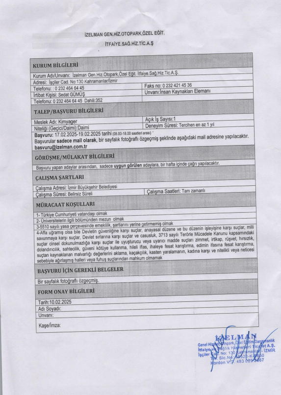 İzmir İzelman Gen. Hiz. Otopark Özel Eğit. İtfaiye Sağ. Hiz. Tic. A.Ş. 1 kimyager alımı yapacak.