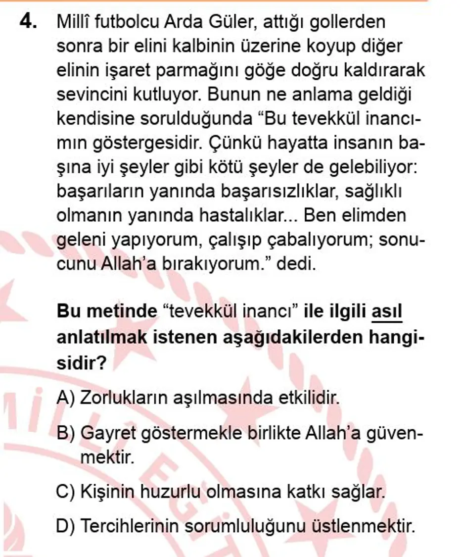 Arda Güler'in meşhur gol sevincinin örnek gösterildiği soruda "tevekkül inancı"na değinildi.