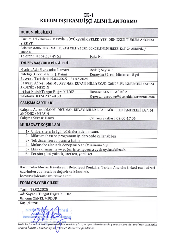 Mersin Büyükşehir Belediyesi Denizkızı Turizm Anonim Şirketi 1 muhasebe elemanı alacak.