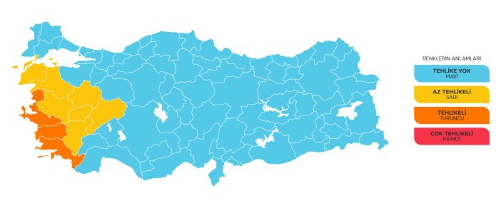 Meteoroloji Genel Müdürlüğü tarafından yapılan tahmine göre, Güney Ege'de, öğle saatlerinden itibaren Kuzey Ege ile Balıkesir'in batısı ve Çanakkale'de güney ve güneydoğu yönlerden kuvvetli rüzgar ve fırtına (50-80 km/saat), İzmir, Aydın ve Muğla illerinin batı ve yüksek kesimlerinde yer yer kuvvetli fırtına (70-90 km/saat) bekleniyor.