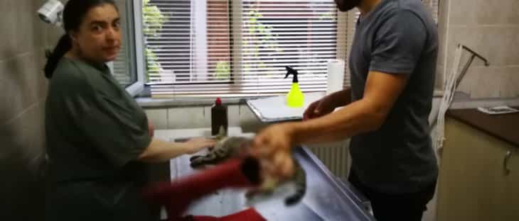 O sırada orada bulunan hayvansever Furkan Selim Çetin tarafından kurtarılan kedi hemen veterinere götürüldü.