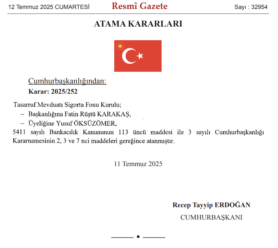 12 Temmuz 2025 tarihli ve 32954 sayılı Resmî Gazete’de yayımlanan Cumhurbaşkanlığı atama kararlarına göre, Tasarruf Mevduatı Sigorta Fonu (TMSF) Kurulu'nda önemli değişiklikler yapıldı.