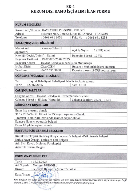Trabzon Hayratbel Personel Ltd. Şti. 1 kazıcı-yükleyici operatörü alacak.