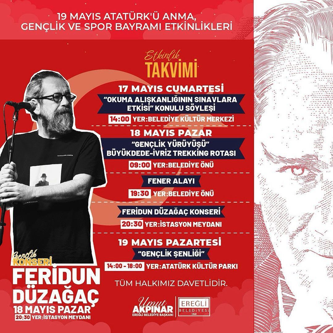 Konya Ereğli Belediyesi, 19 Mayıs Atatürk’ü Anma, Gençlik ve Spor Bayramı kapsamında 18 Mayıs Pazar akşamı düzenlenecek fener alayının ardından ünlü sanatçı Feridun Düzağaç’ı İstasyon Meydanı'nda Ereğlililerle buluşacak.