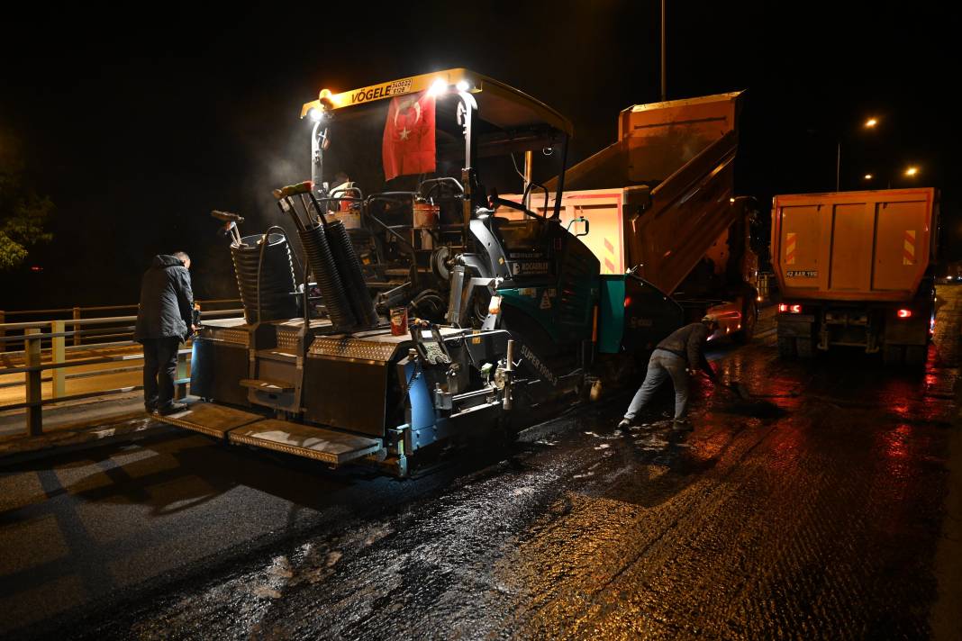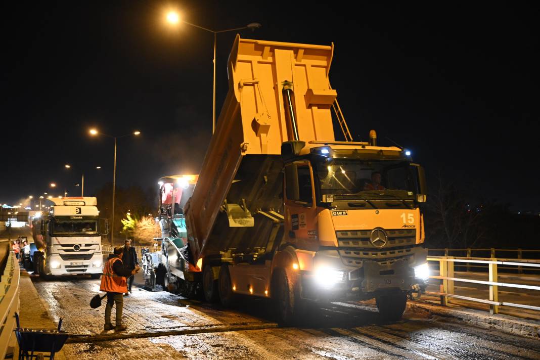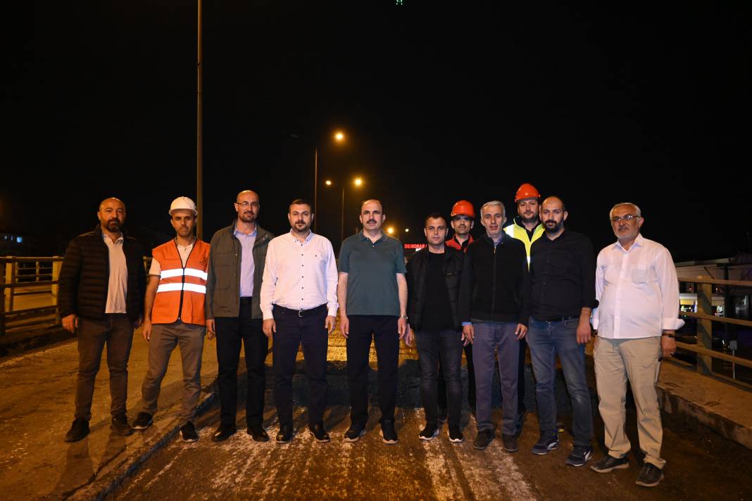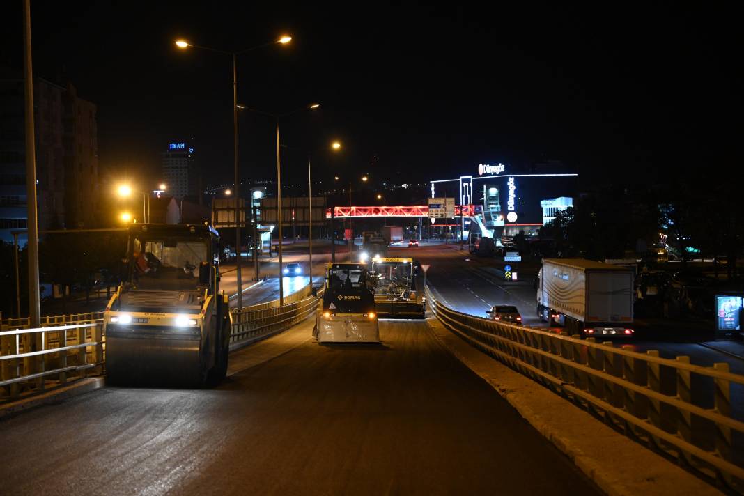Konya’nın en yoğun kavşaklarından biri olan Koyuncu Köprülü Kavşağı’nda da asfalt yenileme çalışması başlattıklarını ifade eden Başkan Altay, “Üst geçitte arkadaşlarımız yoğun bir şekilde çalışıyor. Şu anda saat 11.35. Sabah 06.00’ya kadar buradaki çalışmaları tamamlamak için 30 araç ekipman ve çalışanlarımızla yoğun bir gayret içerisindeyiz. Amaç günlük trafiği rahatsız etmeden şehrimizi yenilemek. İnşallah şehrimizdeki bu çalışmaları sezon boyunca devam ettirip Konyalılara daha konforlu bir ulaşım sağlamayı hedefliyoruz. Gecenin bu saatinde yoğun bir gayret gösteren tüm çalışma arkadaşlarıma teşekkür ediyor, kolaylıklar diliyorum” diye konuştu.