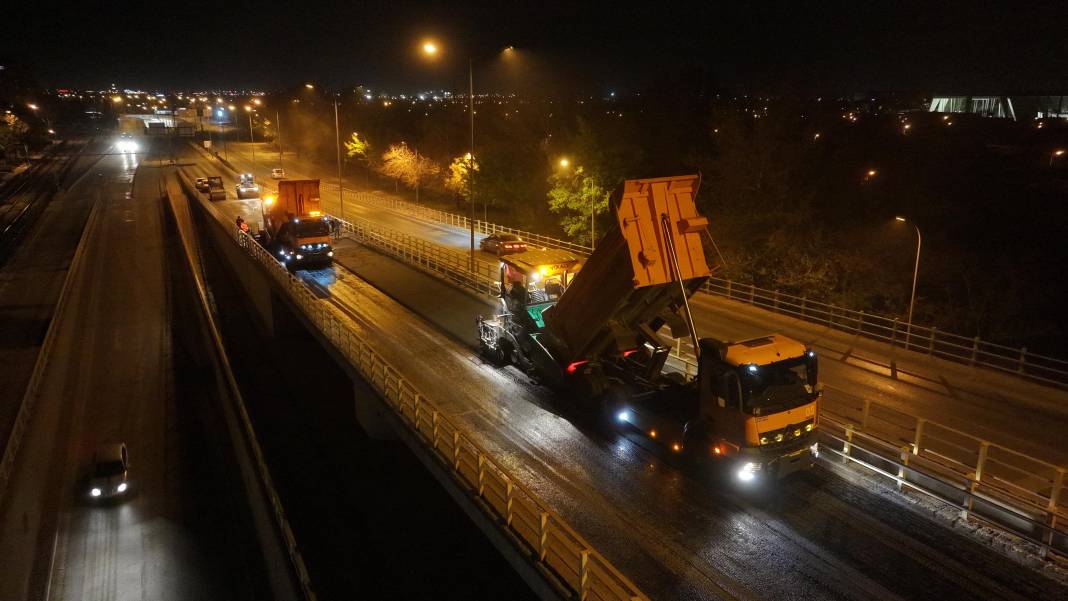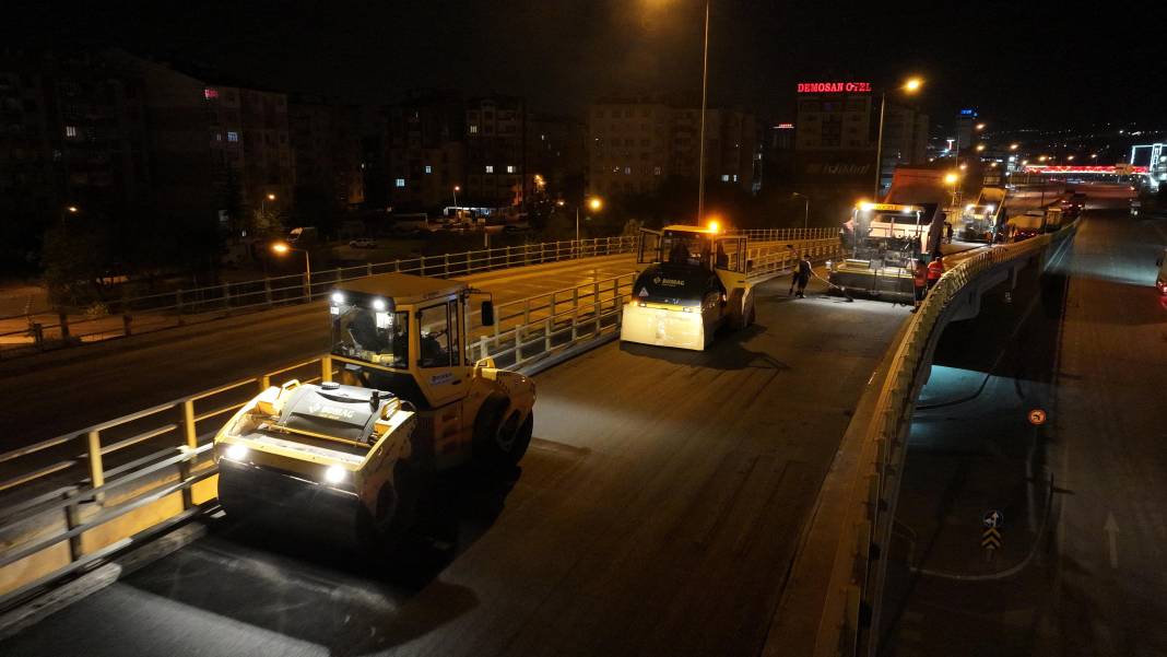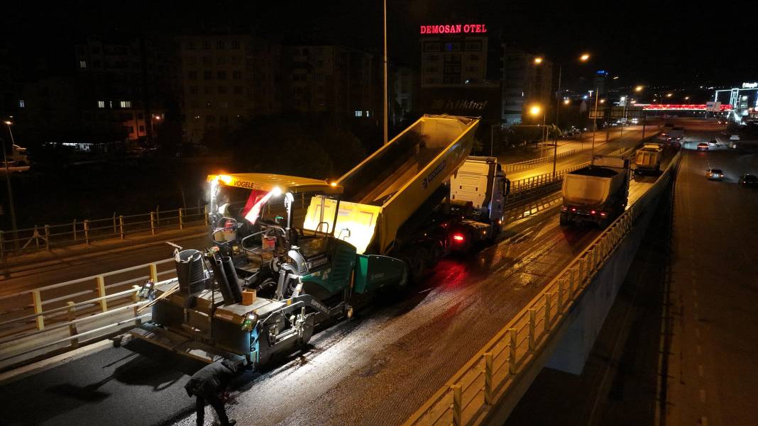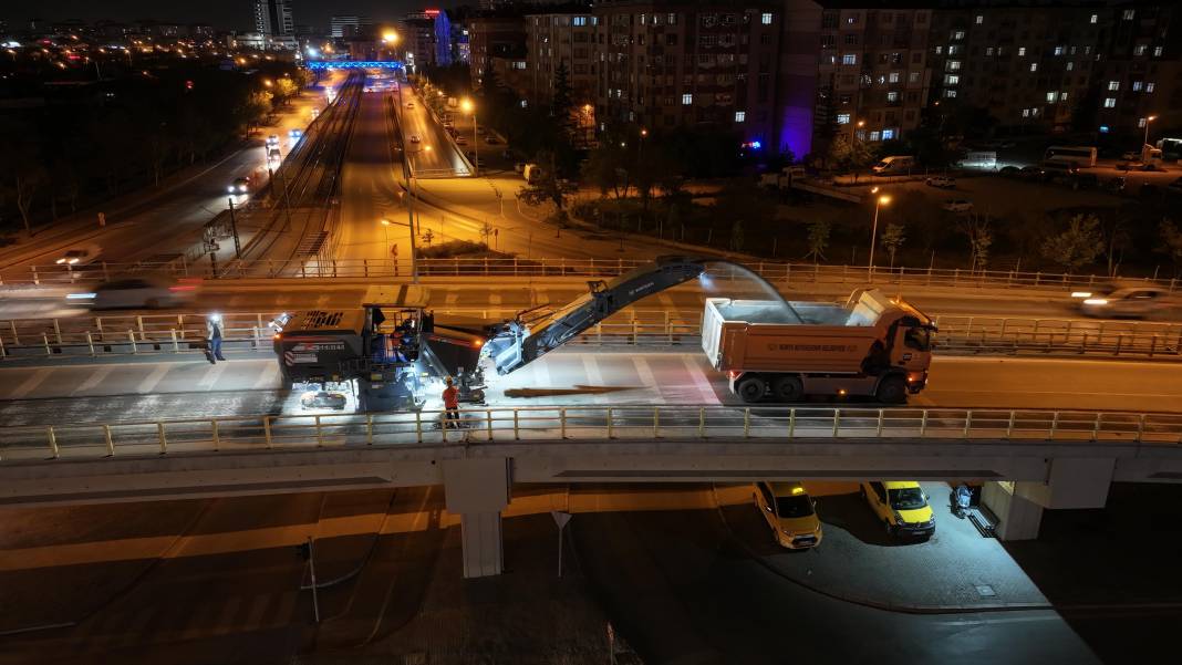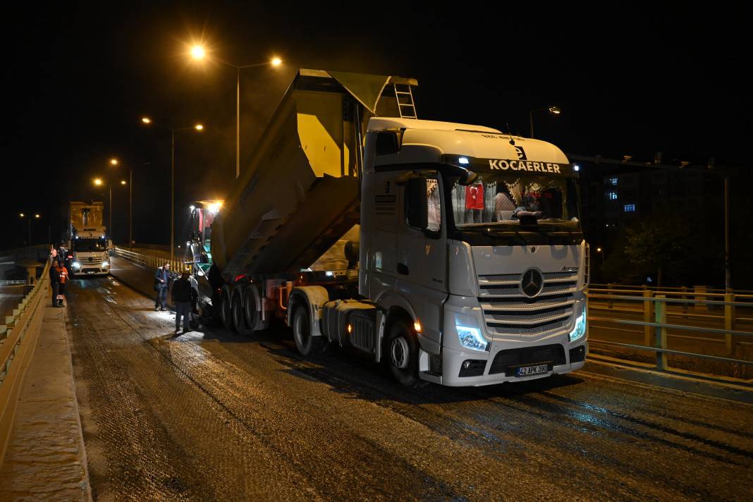 Konya Büyükşehir Belediyesi, şehrin önemli ulaşım noktalarından biri olan Koyuncu Köprülü Kavşağı’nda gece saatlerinde asfalt yenileme çalışmaları gerçekleştiriyor.