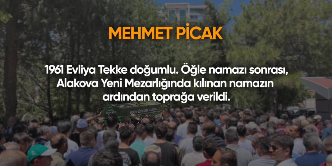 Mehmet Picak. 1961 Evliya Tekke doğumlu. Öğle namazı sonrası, Alakova Yeni Mezarlığında kılınan namazın ardından toprağa verildi.