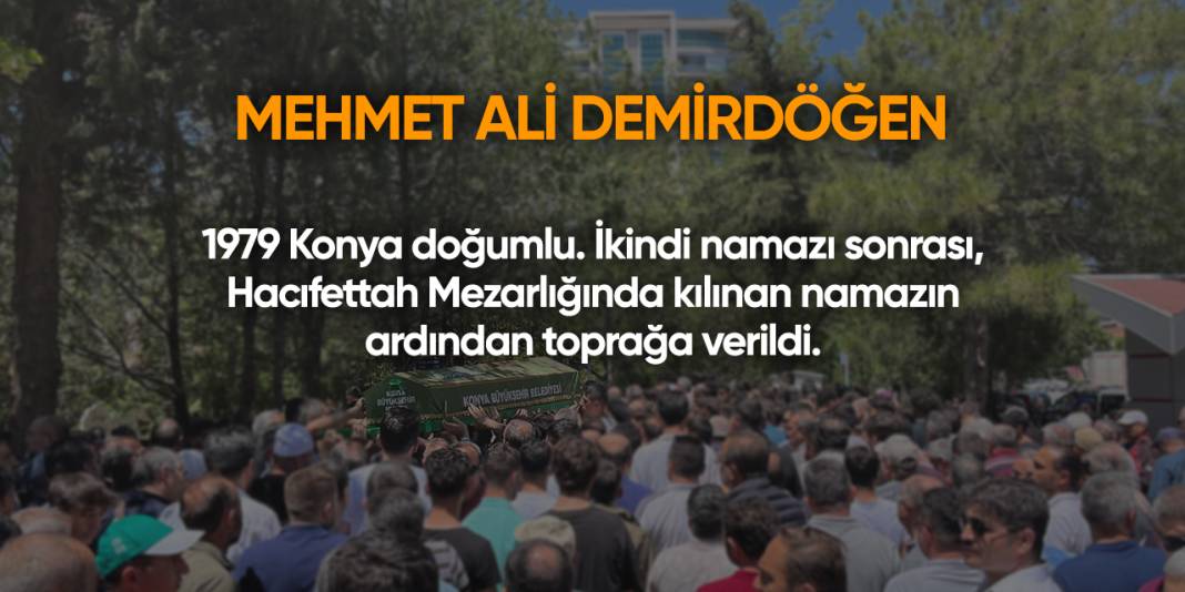 Mehmet Ali Demirdöğen. 1979 Konya doğumlu. İkindi namazı sonrası, Hacıfettah Mezarlığında kılınan namazın ardından toprağa verildi.
