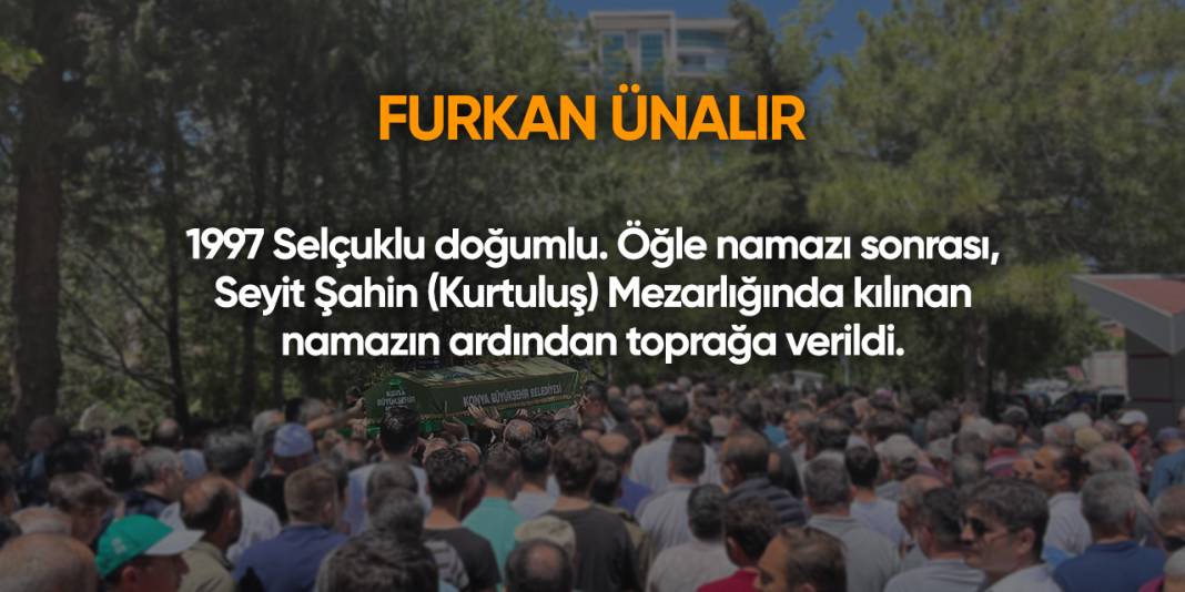 Furkan Ünalır. 1997 Selçuklu doğumlu. Öğle namazı sonrası, Seyit Şahin (Kurtuluş) Mezarlığında kılınan namazın ardından toprağa verildi.