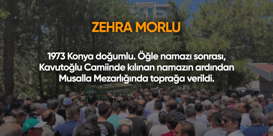 Zehra Morlu. 1973 Konya doğumlu. Öğle namazı sonrası, Kavutoğlu Camiinde kılınan namazın ardından Musalla Mezarlığında toprağa verildi.