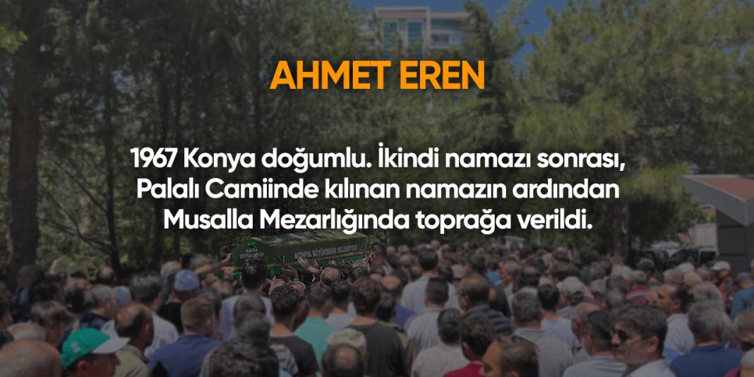Ahmet Eren. 1967 Konya doğumlu. İkindi namazı sonrası, Palalı Camiinde kılınan namazın ardından Musalla Mezarlığında toprağa verildi.