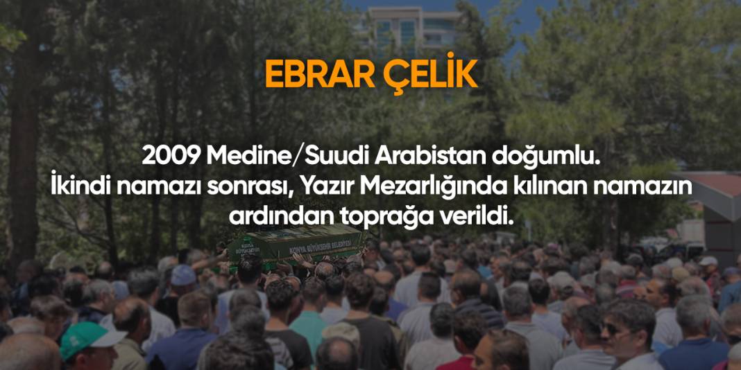 Ebrar Çelik. 2009 Medine/Suudi Arabistan doğumlu. İkindi namazı sonrası, Yazır Mezarlığında kılınan namazın ardından toprağa verildi.
