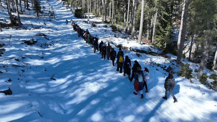 Katılımcılar, diyetisyen Cansu Dölek ve ekibi ile birlikte Anamas Dağı’nın Muslu yaylasında kar örtüsü üzerinde düzenlenen doğa yürüyüşünde bir araya geldi.
