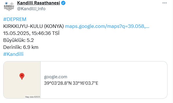 Kandilli Rasathanesi de depremin merkez üssünü Kırkkuyu - Kulu - Konya olarak açıkladı.