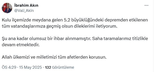 Konya Valisi İbrahim Akın da sosyal medya hesabından yaptığı açıklamada, "Kulu ilçemizde meydana gelen 5.2 büyüklüğündeki depremden etkilenen tüm vatandaşlarımıza geçmiş olsun dileklerimi iletiyorum. Şu ana kadar olumsuz bir ihbar alınmamıştır. Saha taramalarımız titizlikle devam etmektedir. Allah ülkemizi ve milletimizi tüm afetlerden korusun." ifadelerini kullandı.