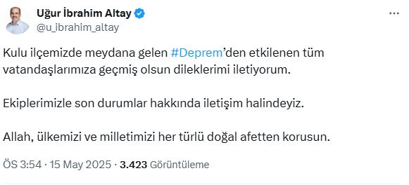 Konya Büyükşehir Belediye Başkanı Uğur İbrahim Altay, "Kulu ilçemizde meydana gelen depremden etkilenen tüm vatandaşlarımıza geçmiş olsun dileklerimi iletiyorum. Ekiplerimizle son durumlar hakkında iletişim halindeyiz. Allah, ülkemizi ve milletimizi her türlü doğal afetten korusun." dedi.