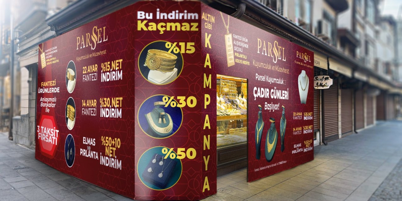 Yüzükten kolyeye, pırlantadan elmasa kadar 15 bin farklı takı modeli, Parsel Kuyumculuk mağazalarının önünde kurulan özel çadırlarda satışa sunuluyor. Kampanyada; 14 ayar fantezi ürünlerde %30’a varan indirim, 22 ayar fantezi ürünlerde %15 net indirim, elmas ve pırlantalarda %50+%10 indirim, anlaşmalı bankalarla 3 taksit avantajı vatandaşların ilgisine sunuldu.