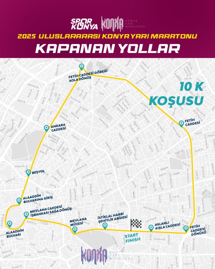 18 Mayıs Pazar günü düzenlenecek olan 2025 Uluslararası Konya Yarı Maratonu nedeniyle 09.00 ile 15.00 saatleri arasında maraton parkuru üzerindeki bazı yollar araç ve yaya trafiğine kapatılacak. İşte Konya kapalı yollar listesi.