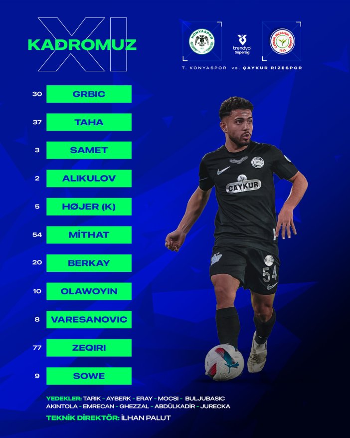 Rizespor XI: Grbic, Hojer, Samet Akaydin, Alikulov, Muhammet Taha Şahin, Varesanovic, Berkay Özcan, Olawoyin, Mithat Pala, Zeqiri, Sowe.