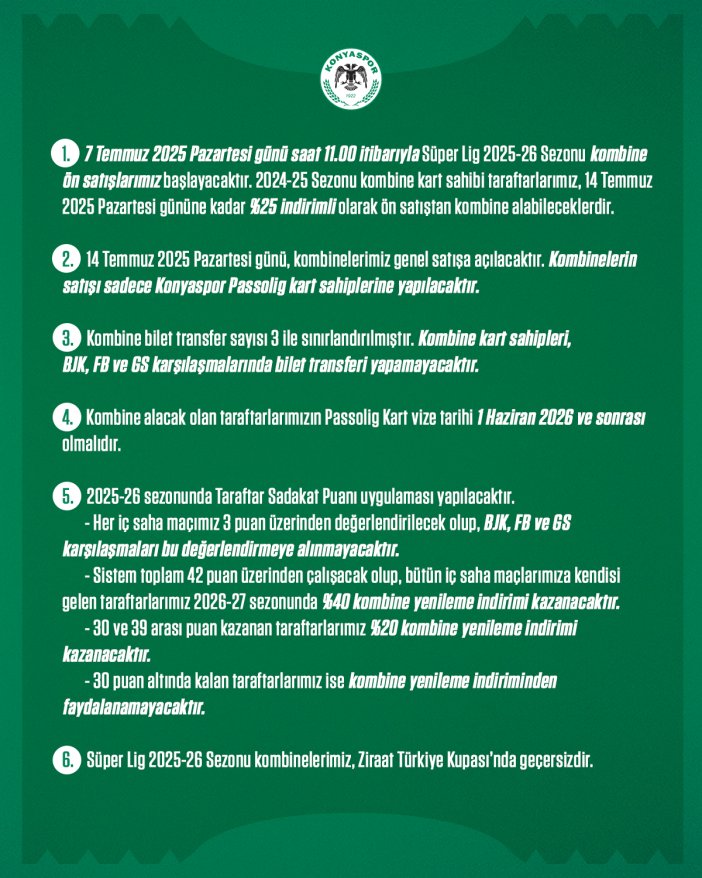 Konyaspor, 2025-2026 Süper Lig sezonu kombine satış süreci için detayları paylaştı. 7 Temmuz 2025 Pazartesi günü saat 11.00 itibarıyla, bir önceki sezon kombine sahibi taraftarlar için ön satışlar başlıyor. Bu taraftarlar, 14 Temmuz’a kadar %25 indirimle kombine satın alabilecek.