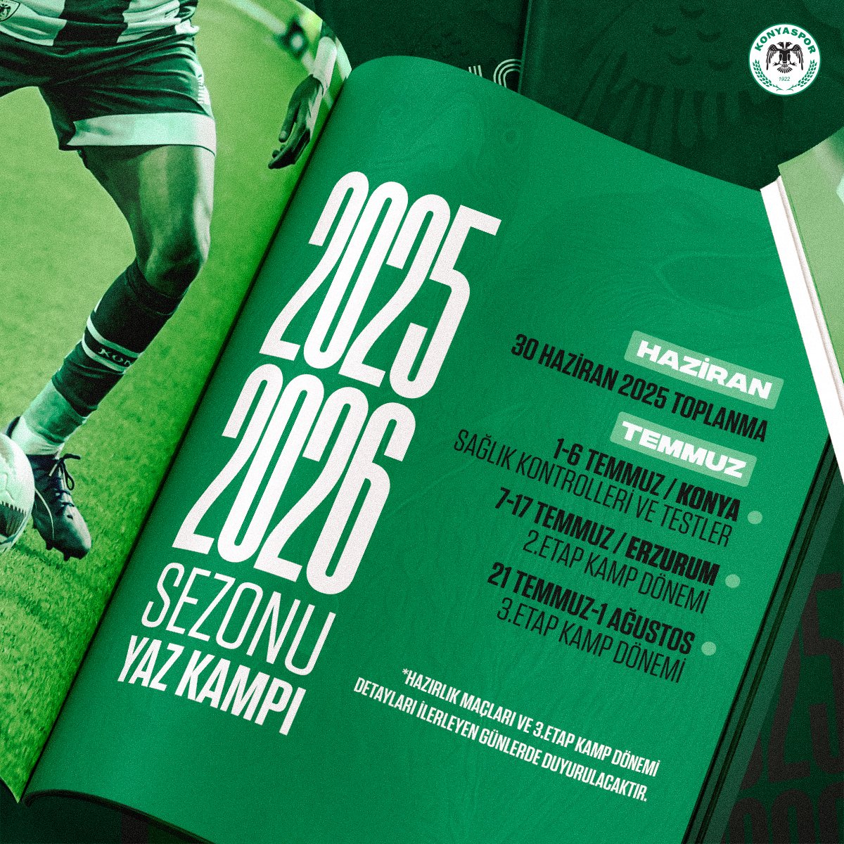 Konyaspor, 2025-26 Süper Lig sezonu hazırlıklarına 30 Haziran’da Kayacık Tesisleri’nde başlayacak. Takım, Erzurum kampında iki hazırlık maçı oynayacak. Üçüncü kampın detayları ise yakında açıklanacak.