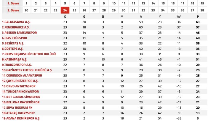 Trendyol Süper Lig'de 24. haftanın sonuçları, puan durumu ve 25. haftanın maç programı şöyle: