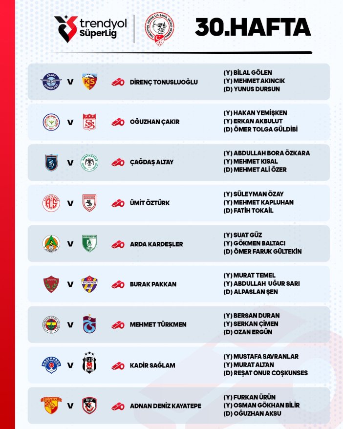 Trendyol Süper Lig Şamil Ekinci Sezonu'nun 30. hafta müsabakalarında görev yapacak olan hakemler ve yardımcıları Veri Tabanlı Atama Sistemi (VeTAS) ile belirlendi.
