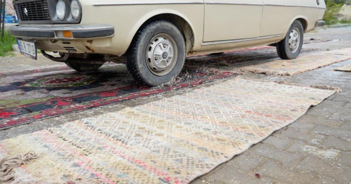 Tezgahlarda hünerli ellerin dokuduğu halılar cadde ve sokaklara serilerek güneşte bekletiliyor. Asfaltta yaklaşık 10-15 gün bekletilen ve üzerinden birçok aracın geçtiği halılar inceliyor ve eskimiş görüntüsü veriliyor. Üzerinden ne kadar çok araç geçerse o kadar eski görünümüne kavuşan halılar, değerine değer katıyor.