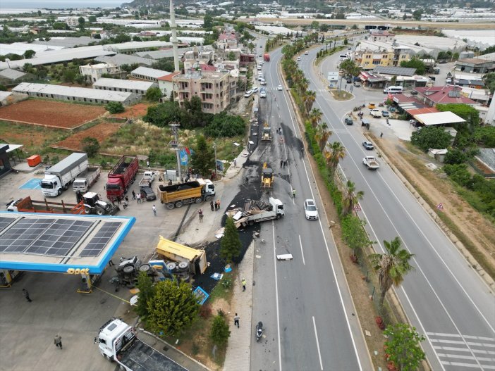 Antalya'nın Gazipaşa ilçesinde, freni patlayan sıcak asfalt yüklü kamyon iki araca çarptıktan sonra akaryakıt istasyonuna devrildi. Güvenlik kamerasına yansıyan feci kazada biri ağır 2 kişi yaralandı.