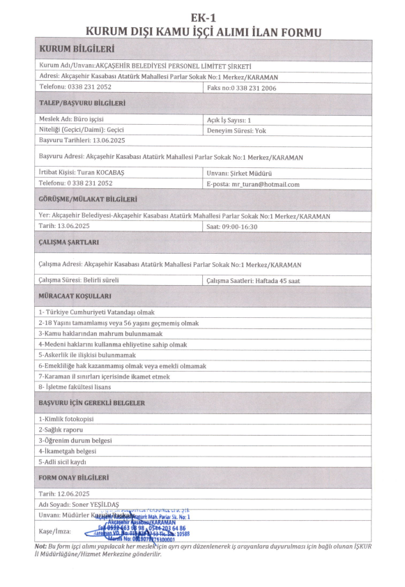 Karaman Akçaşehir Belediyesi işçi alımı 2025