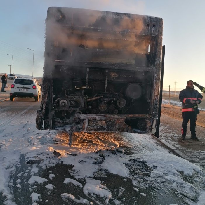 Yolcuları bıraktıktan sonra dönüşe geçen servis otobüsü, seyir halindeyken henüz belirlenemeyen bir nedenle motor kısımı anda alev aldı.