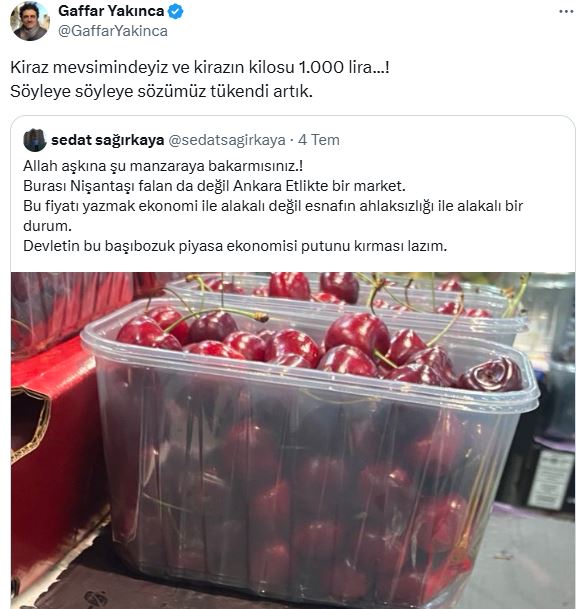 Ankara'da bir vatandaşın gördüğü 999,95 TL’lik kiraz etiketi, sosyal medyada tepkiye neden oldu. Paylaşım kısa sürede binlerce yorum alırken, Tarım ve Orman Bakanlığı ile Ticaret Bakanlığı harekete geçti.