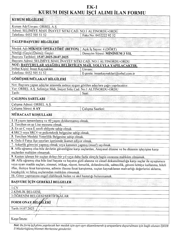 Ordu Orbel A.Ş. Bünyesinde gerçekleştirilecek personel alımıyla ilgili detaylar netleşti.