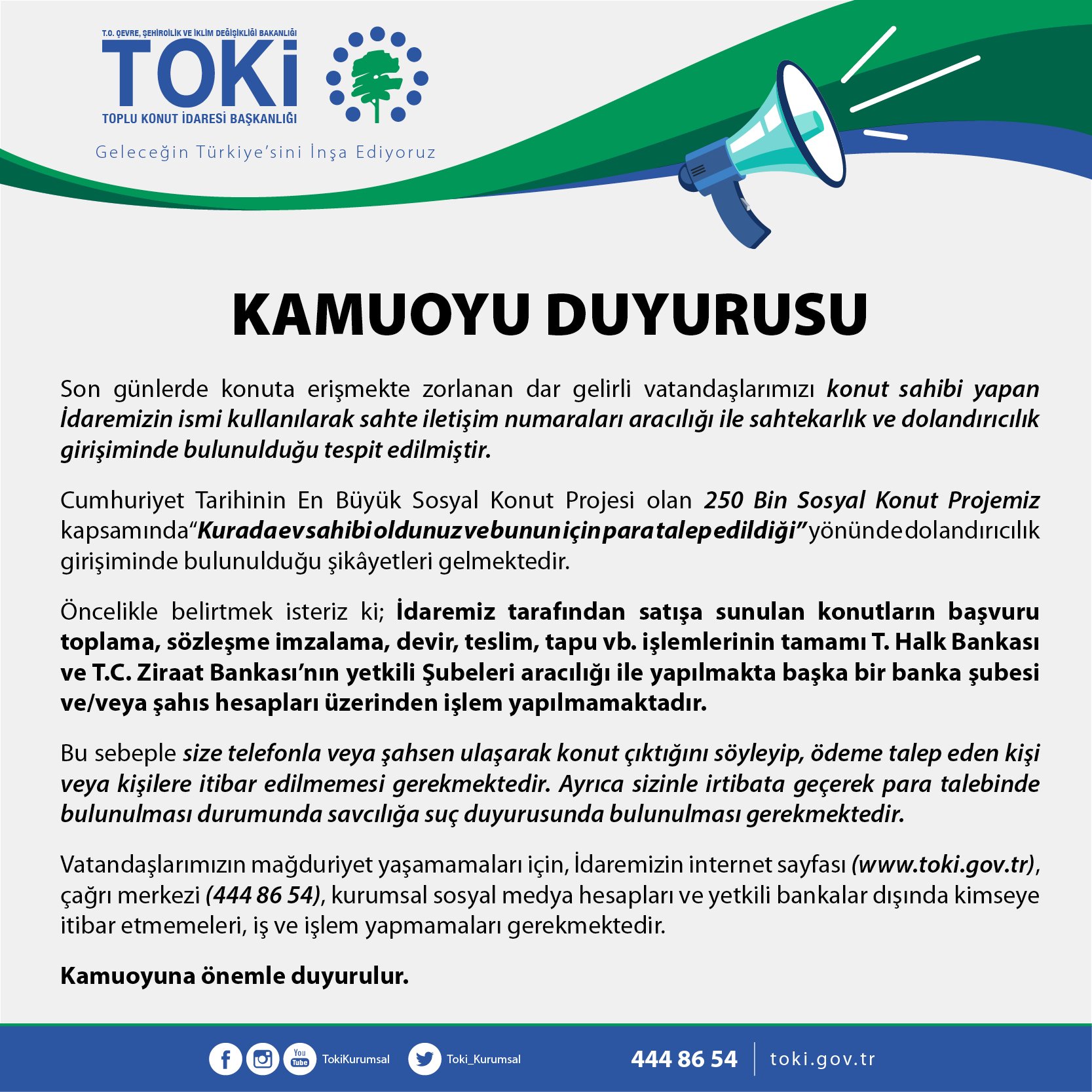 Vatandaşlarımızın mağduriyet yaşamamaları için, İdaremizin internet sayfası (www.toki.gov.tr) çağrı merkezi (444 86 54), kurumsal sosyal medya hesapları ve yetkili bankalar dışında kimseye itibar etmemeleri, iş ve işlem yapmamaları gerekmektedir."