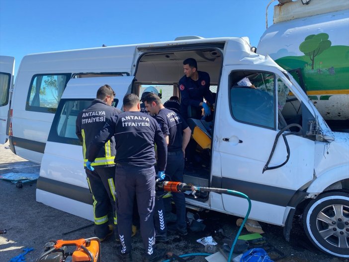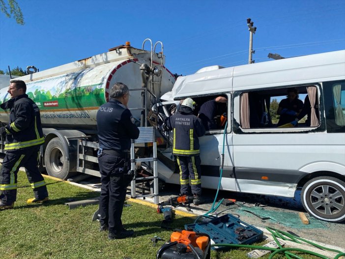 Antalya'nın Serik ilçesinde tur minibüsünün sulama tankerine çarpması sonucu ilk belirlemelere göre 4'ü yabancı uyruklu 6 kişi yaralandı.