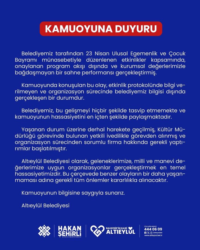 "Belediyemiz tarafından 23 Nisan Ulusal Egemenlik ve Çocuk Bayramı münasebetiyle düzenlenen etkinlikler kapsamında, onaylanan program akışı dışında ve kurumsal değerlerimizle bağdaşmayan bir sahne performansı gerçekleştirmiş. Kamuoyunda konuşulan bu olay, etkinlik protokolünde bilgi verilmeyen ve organizasyon sürecinde belediyemiz bilgisi dışında gerçeklesen bir durumdur, G Belediyemiz, bu gelişmeyi hiçbir şekilde tasvip etmemekte ve kamuoyunun hassasiyetini en içten şekilde paylaşmaktadır. Yaşanan durum üzerine derhal harekete geçilmiş, Kültür Müdürlüğü görevinde bulunan yetkili ivedilikle görevden alinmiş ve organizasyon sürecinden sorumlu firma hakkında gerekli yaptırımlar başlatılmıştır. Altıeylül Belediyesi olarak, geleneklerimize, milli ve manevi değerlerimize uygun organizasyonlar gerçekleştirmek en temel hassasiyetimizdir. Bu çerçevede benzer olayların bir daha yaşanmaması adına gerekli tüm önlemler kararlıkla alınacaktır."