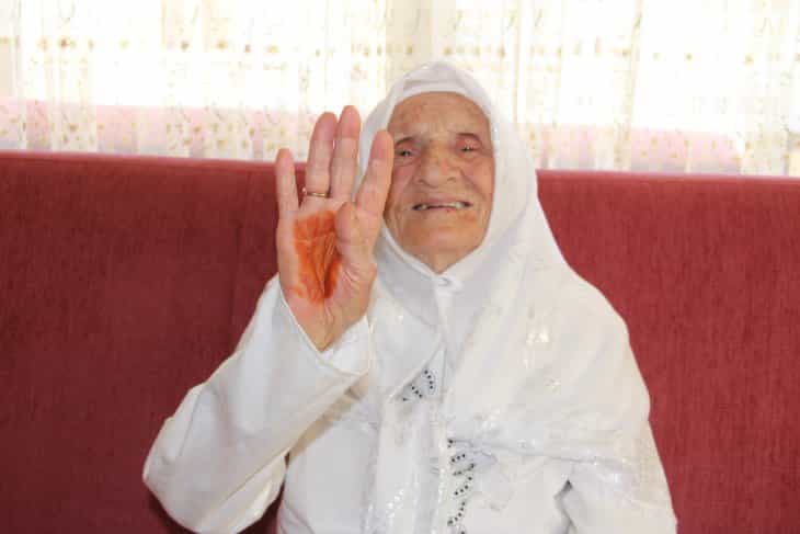 Mersin’de kızıyla birlikte yaşayan Fikriye Çam, uzun yıllardır hayalini kurduğu hacca gitmenin mutluluğunu yaşıyor. 5 çocuğu, 24 torunu ve 20 de torun çocuğu bulunan 105 yaşındaki Fikriye ninenin yüzü sürekli gülüyor ve Erdoğan’a teşekkür ederek dualar ediyor. Fikriye nine, ailenin en küçük üyesi torununun çocuğu 2 aylık Muhammet Sait kucağında, diğer torun çocukları etrafında mutluluk tablosu çiziyor.
