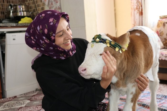 Evde oluşturulan özel bölümde kalan buzağılarını zaman zaman dışarıya çıkaran aile, evde bulundukları zamanlarda ise etrafı kirletmemesi için buzağıyı bezliyor.