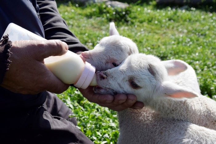 Koyununun tek seferde 5 kuzu dünyaya getirmesinin şaşkınlığını yaşayan besici, annenin sütünün yetmemesi nedeniyle kuzuları biberonla besliyor.