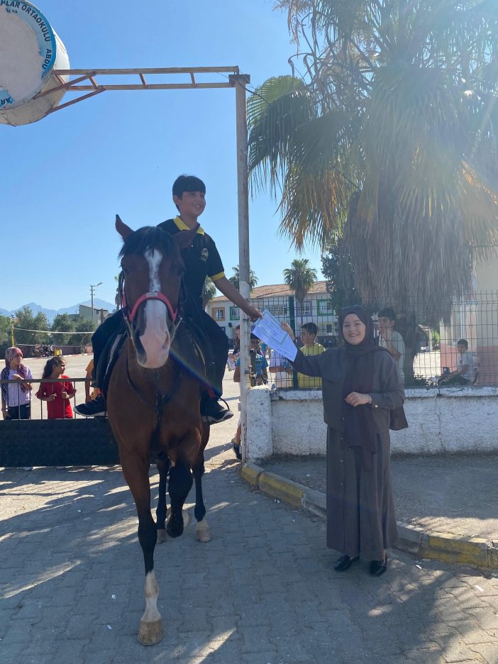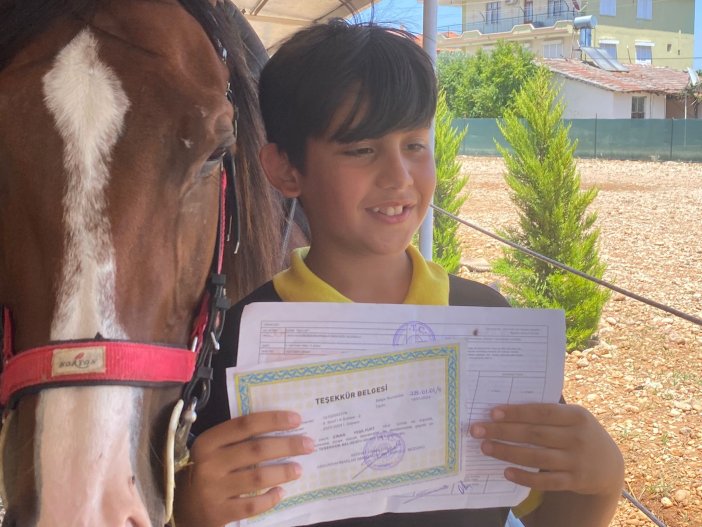 Antalya'nın Serik ilçesinde karne günü renkli görüntülere sahne oldu. Abdurrahmanlar Ortaokulu öğrencisi Çınar Önder'e (12), babası Sezer Önder tarafından karne hediyesi olarak "Kadife" isimli safkan bir Arap atı hediye edildi. Oğluna sürpriz yapmak isteyen baba, karne günü sabahı atı, oğluna hediye etti. Çınar okuluna karne almaya atı ile geldi. Karnesini de atın üzerinde alan atlı öğrenciyi görenler gözlerine inanamadı.